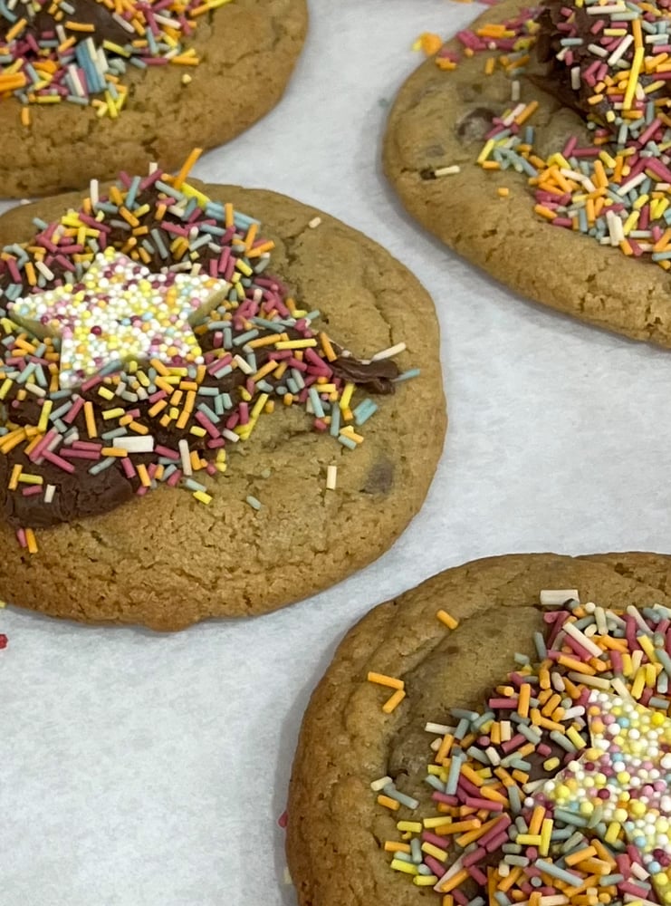A milk chocolate chip cookie, topped with milk chocolate spread, colourful sprinkles and a white chocolate star.
