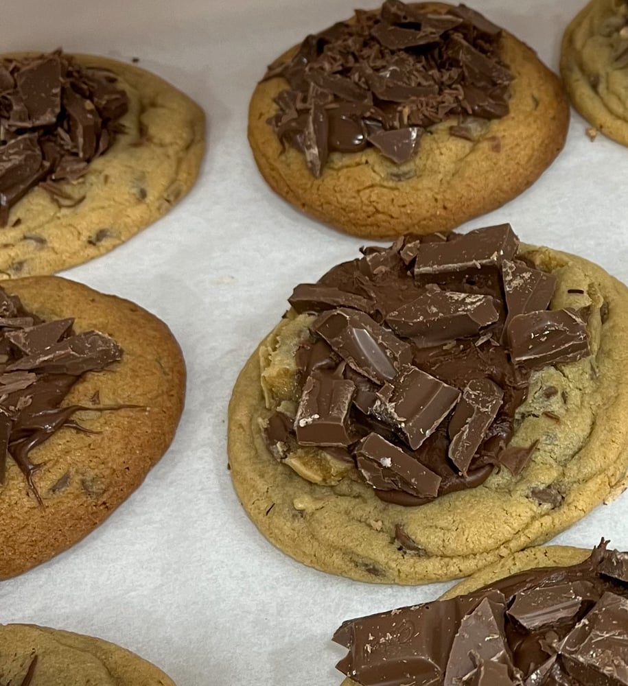 A milk chocolate chip cookie, topped with Nutella and dairy milk chocolate pieces.